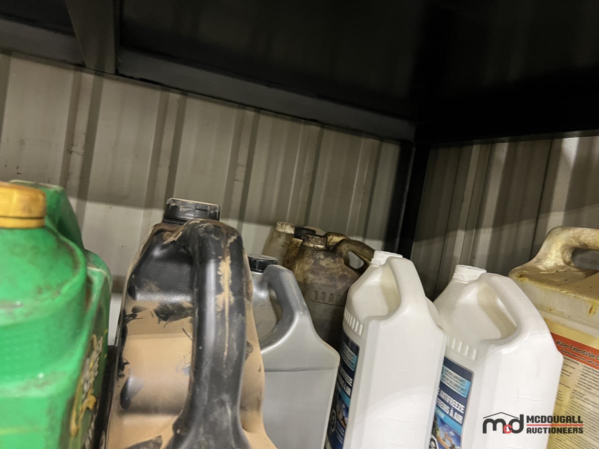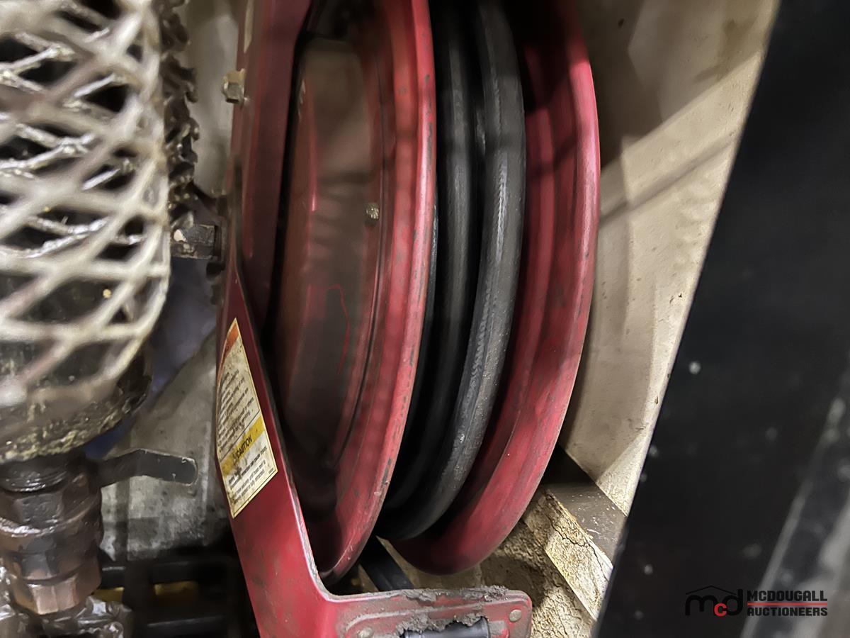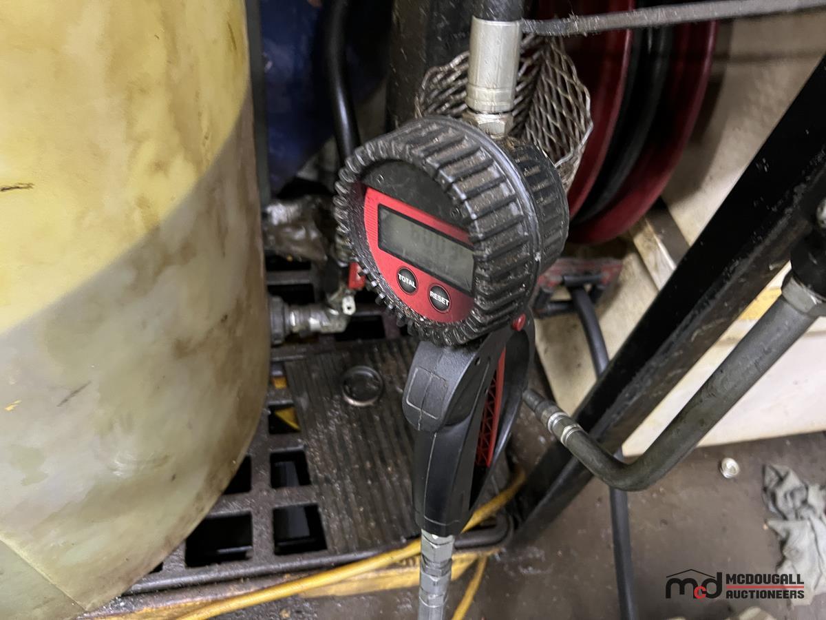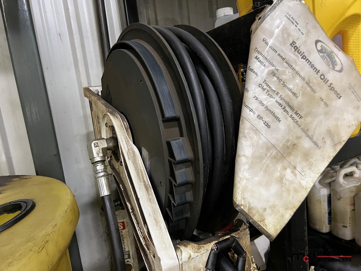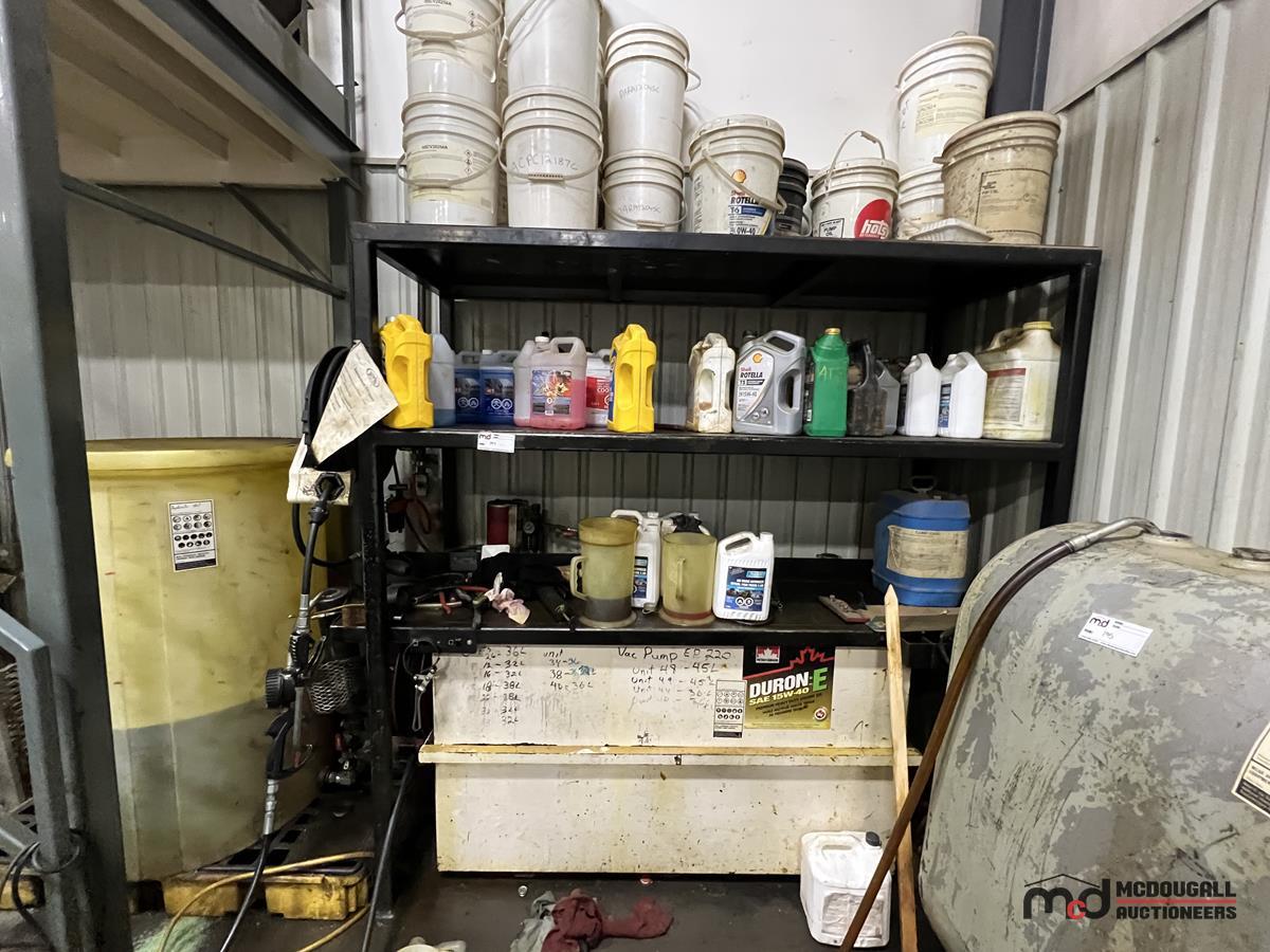 Square Steel Oil Tank w/ (2) Hose Reels, Nozzles, 140-Gallon Cylindrical Oil Tank & Assortment of Vehicle Fluids
