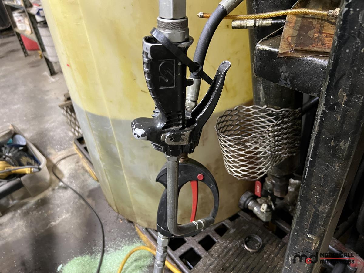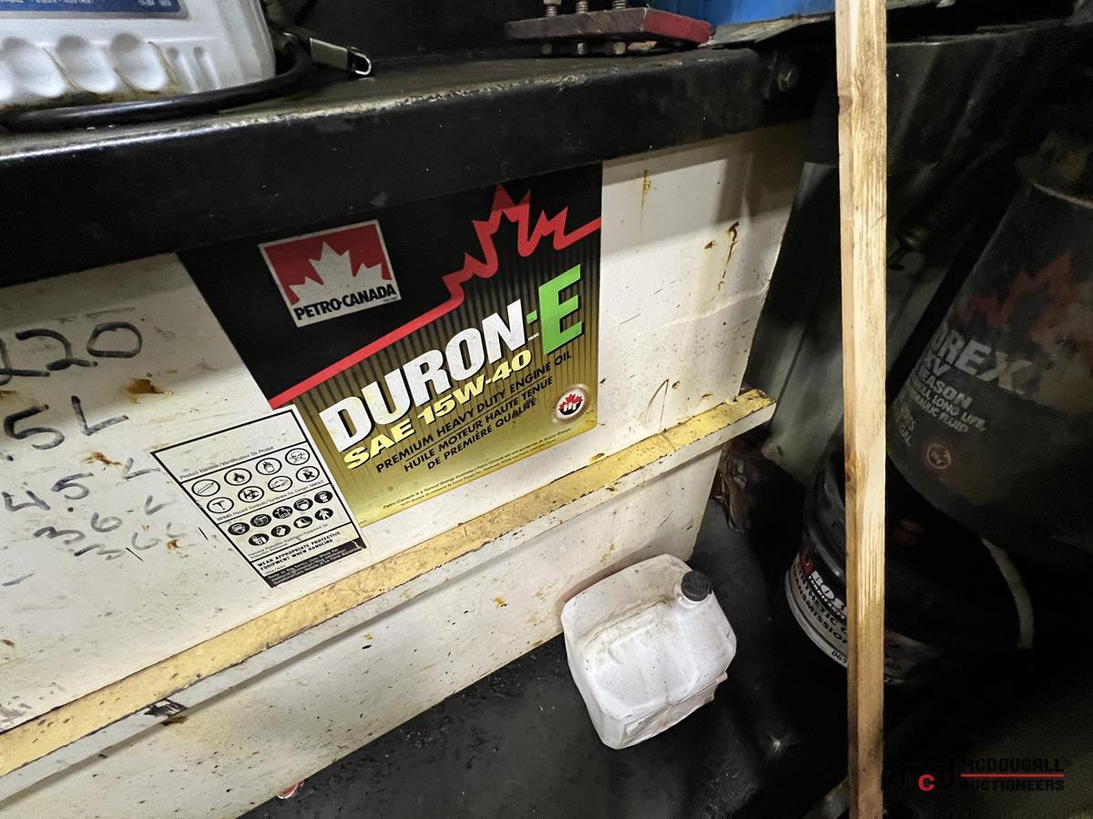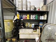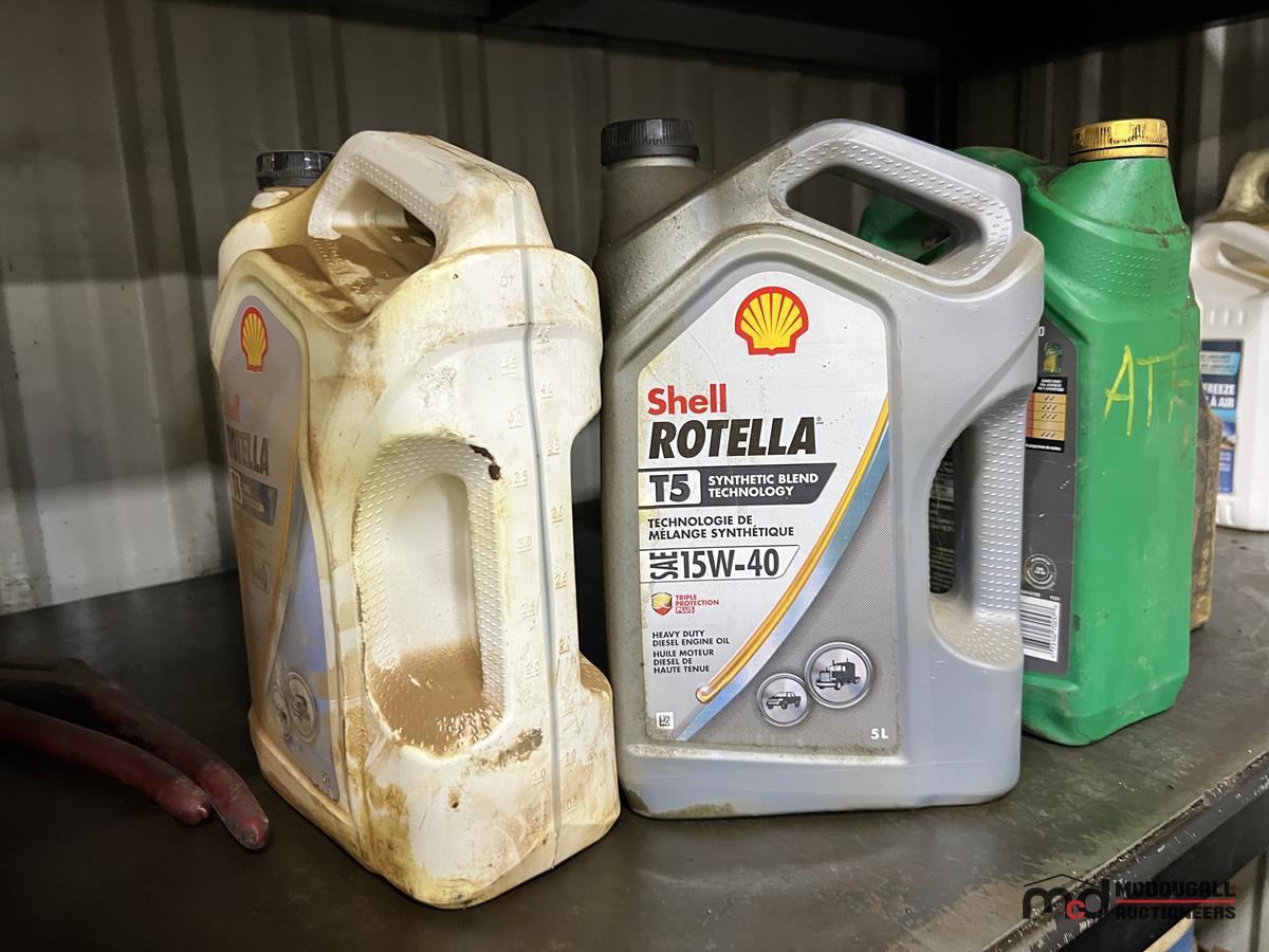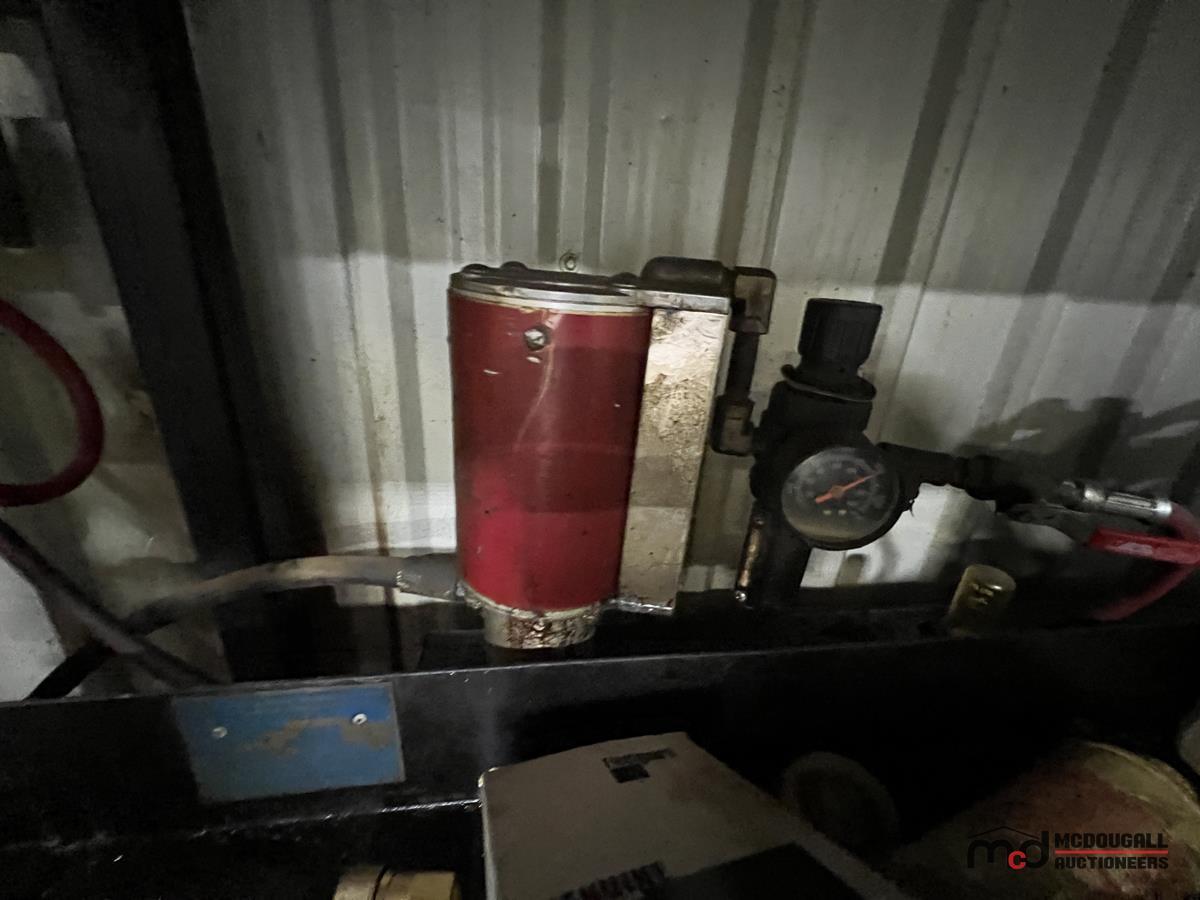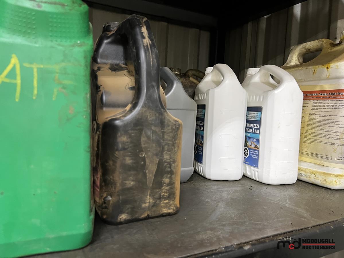 Square Steel Oil Tank w/ (2) Hose Reels, Nozzles, 140-Gallon Cylindrical Oil Tank & Assortment of Vehicle Fluids