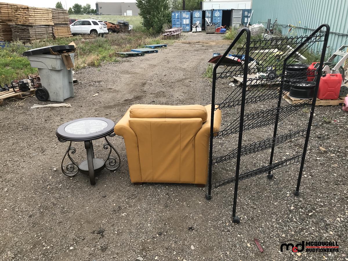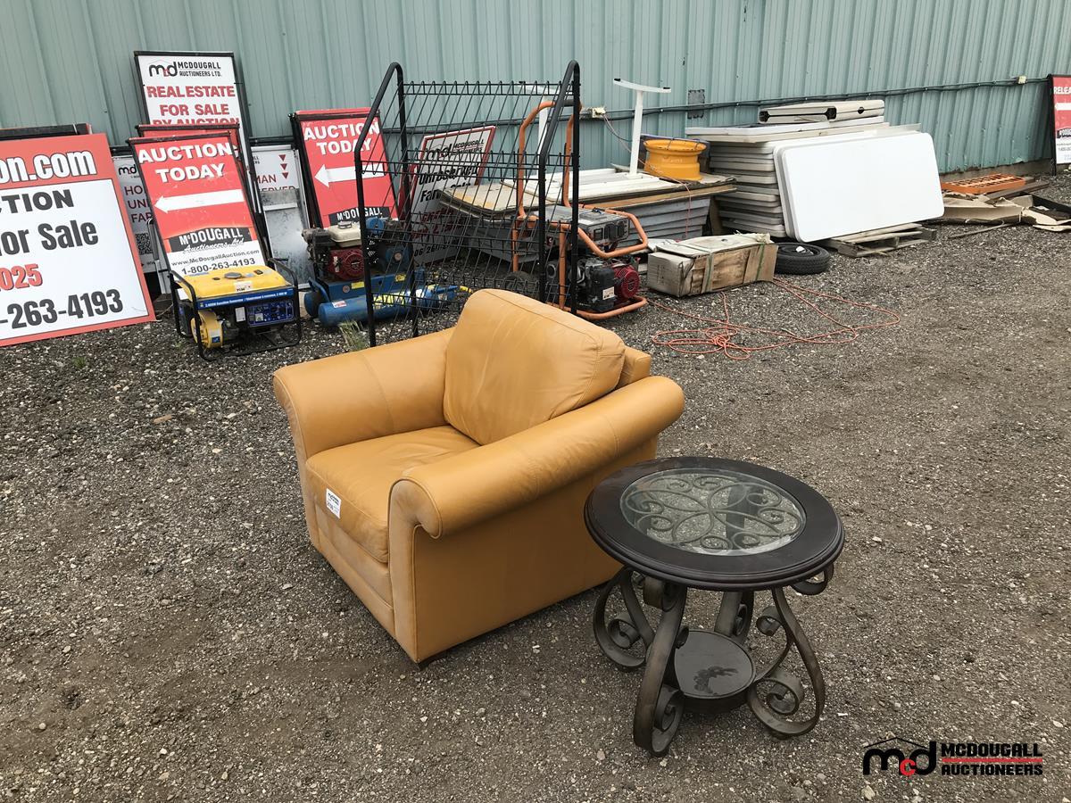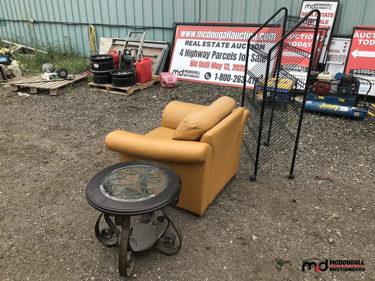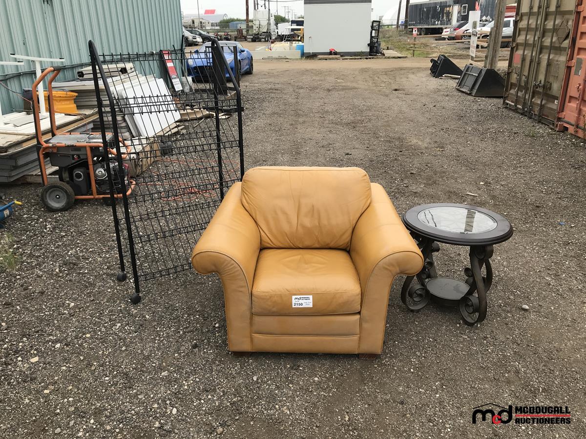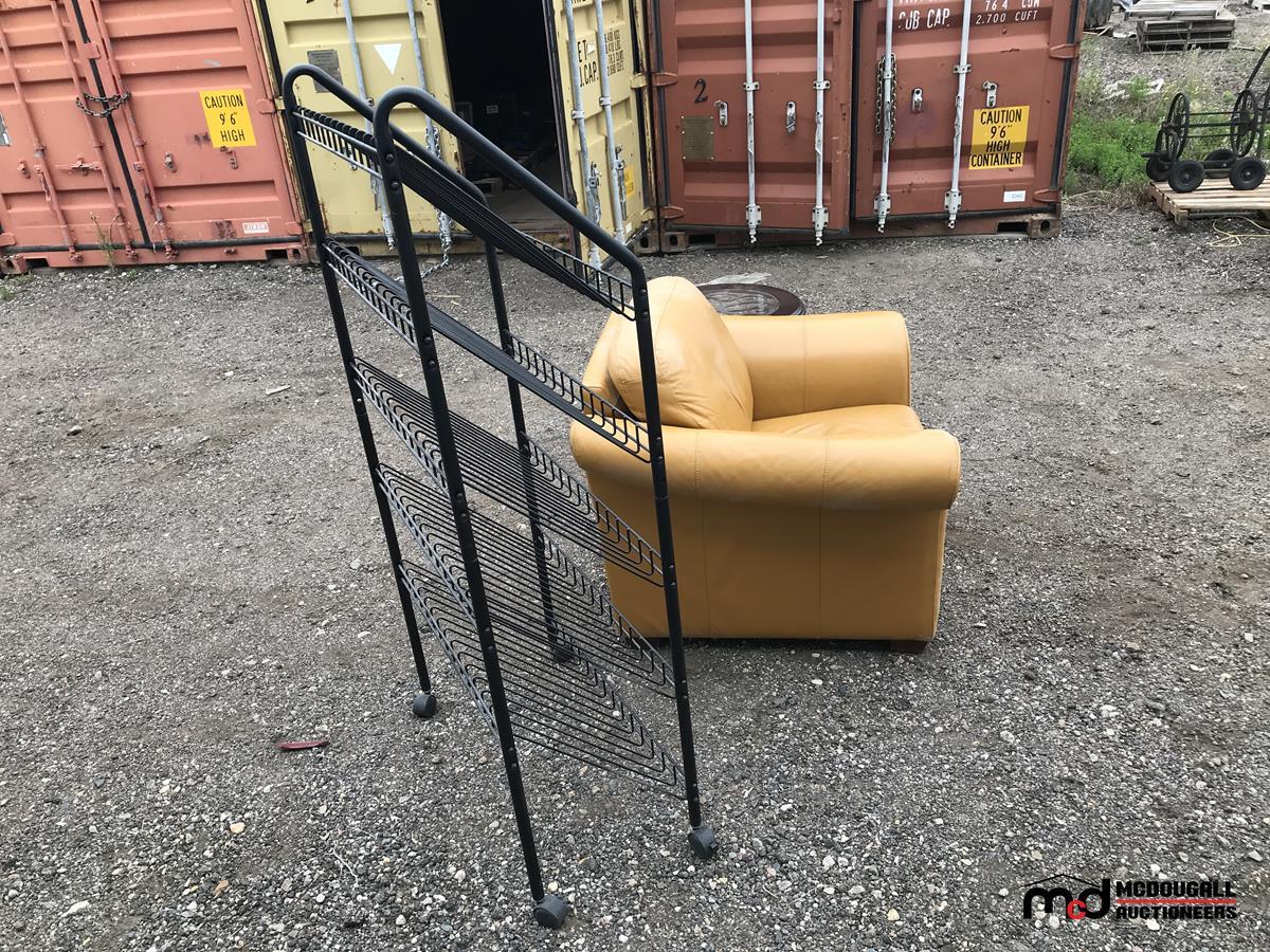 Leather Chair, Rolling Metal Shelf, Round Coffee Table