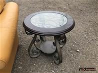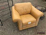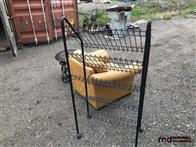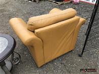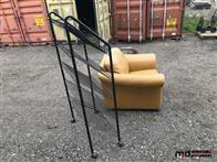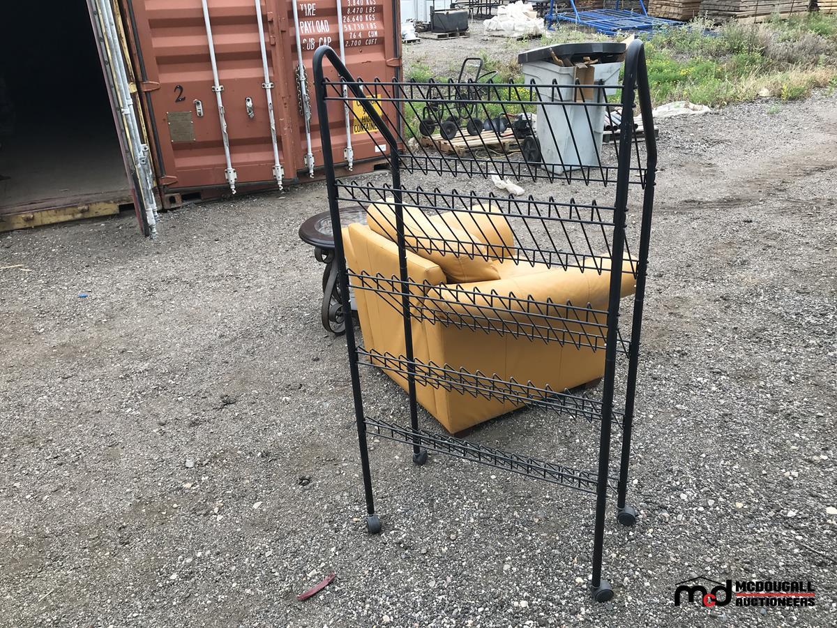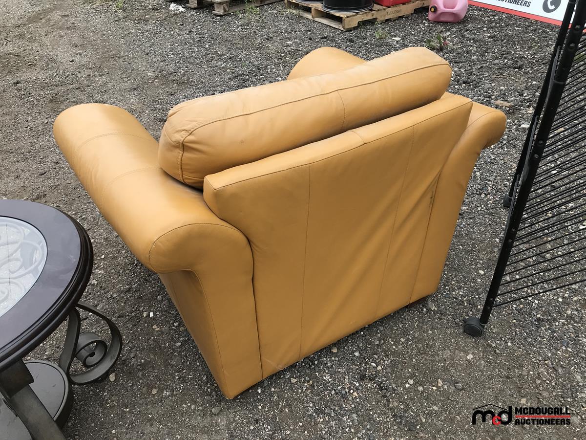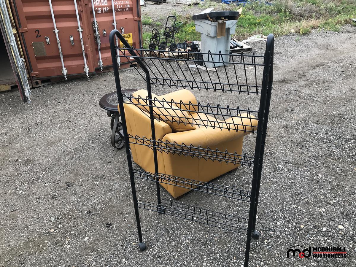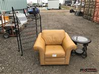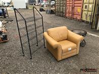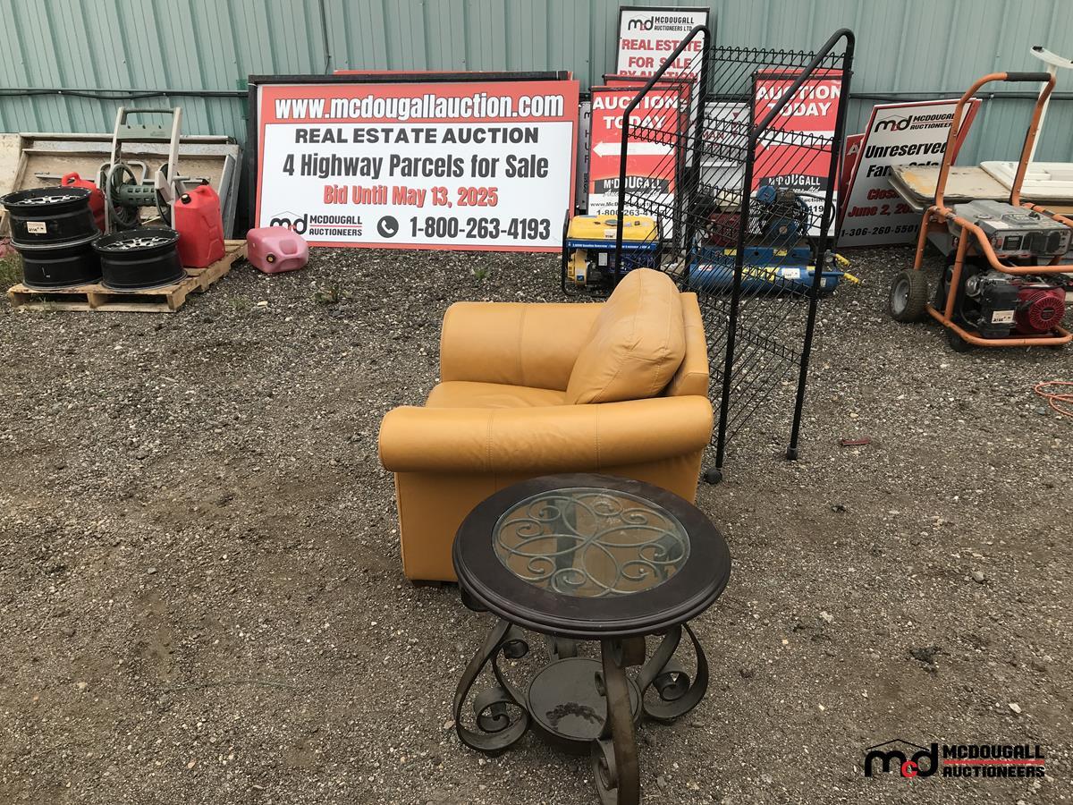 Leather Chair, Rolling Metal Shelf, Round Coffee Table