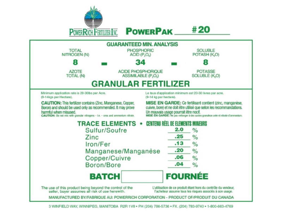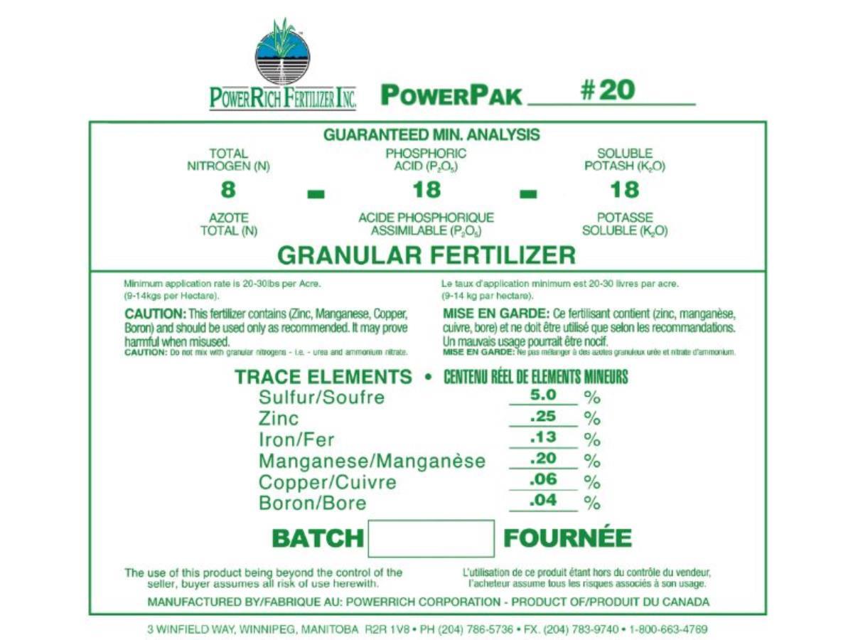 10,000LBS of PowerPak Granular Starter Fertilizer with Micros To be used in conjunction with your nitrogen program. PowerPak Granular is a premium PKS Blend fortified with full spectrum of micronutrients. Our high-quality propriety granular blends are engineered to breakdown, remain available longer and extending phos uptake! Applied at a lower rate than your typical conventional brands, our refined and top-quality blends provide complete nutrition to your crop and soil. 1 x 10,000Lb Bulk Bag of 8-18-18 OR 8-34-8 applied at 20-30LBS/Acre. FOB Winnipeg. Your area agent is available for consultation prior to use at 1-800-491-8984. www.powerrich.com
