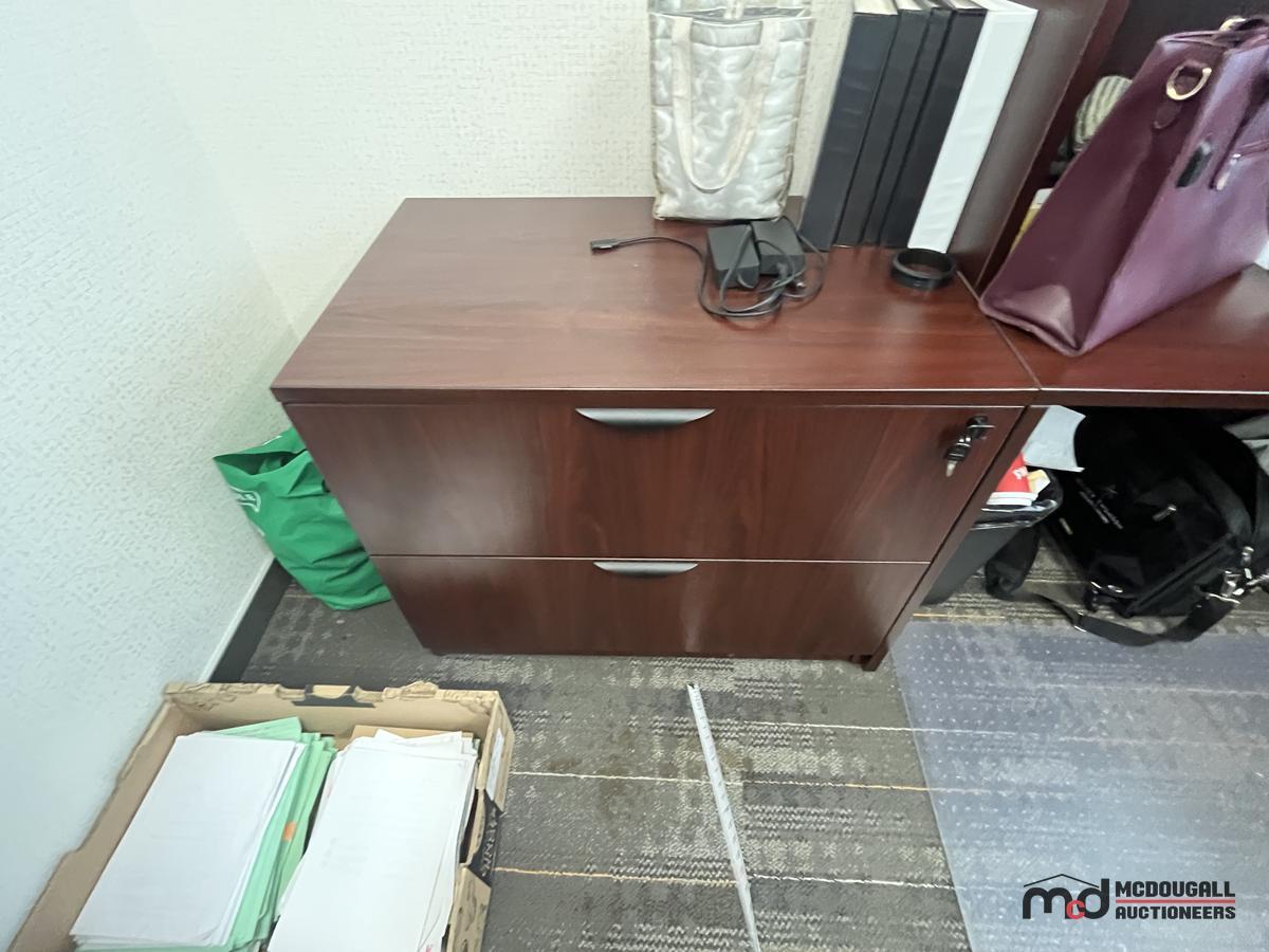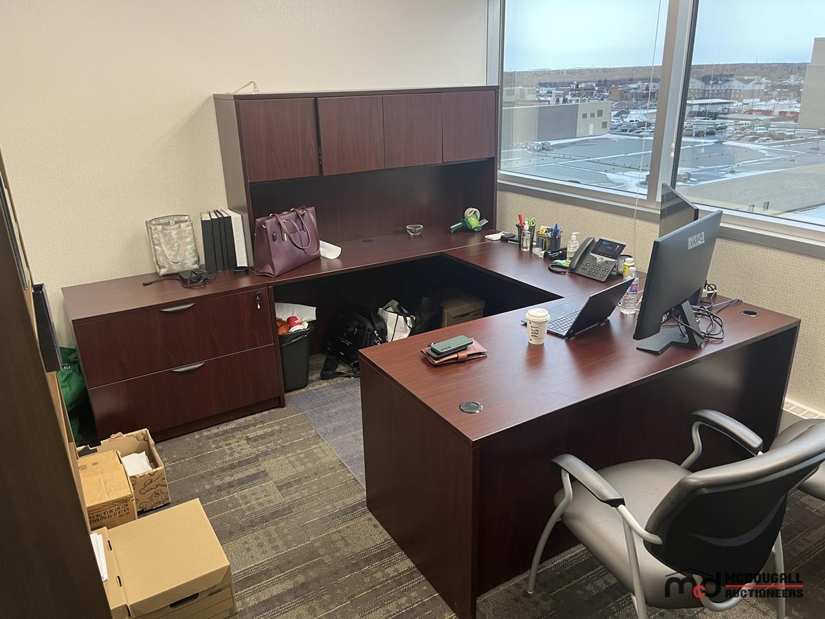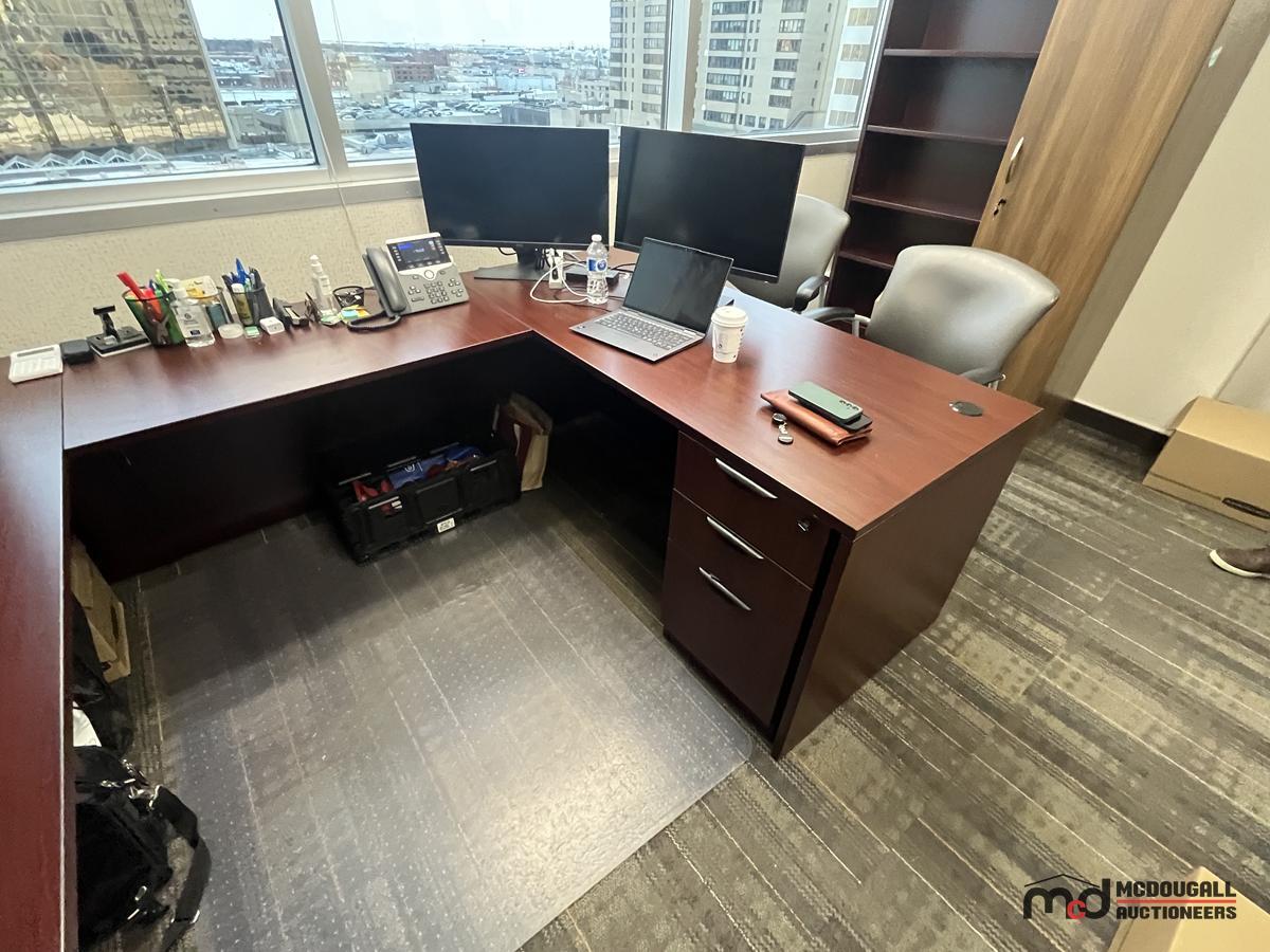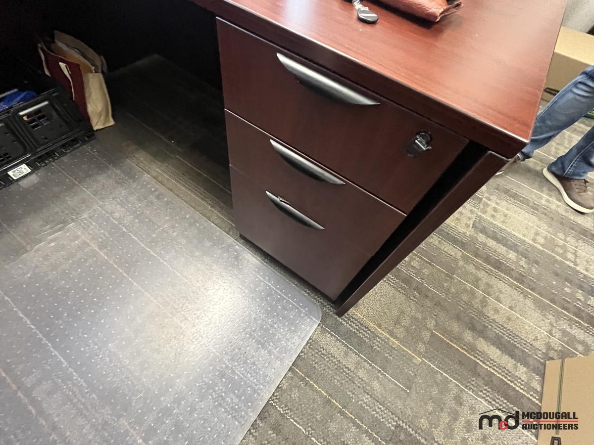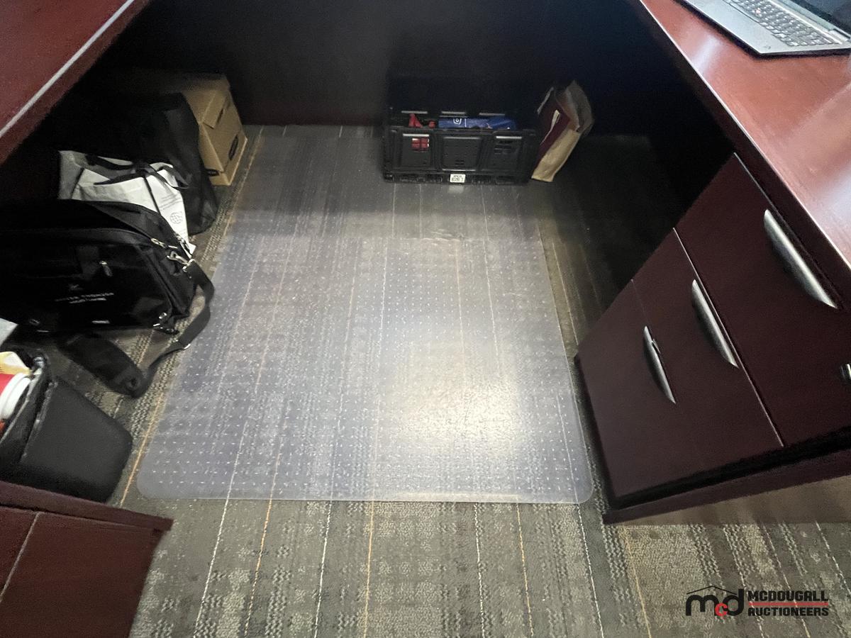 U-Shaped Desk w/ (2) Chairs, (2) 3' Bookshelves, Filing Cabinet & Mat