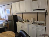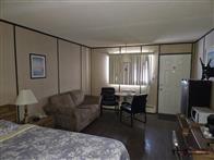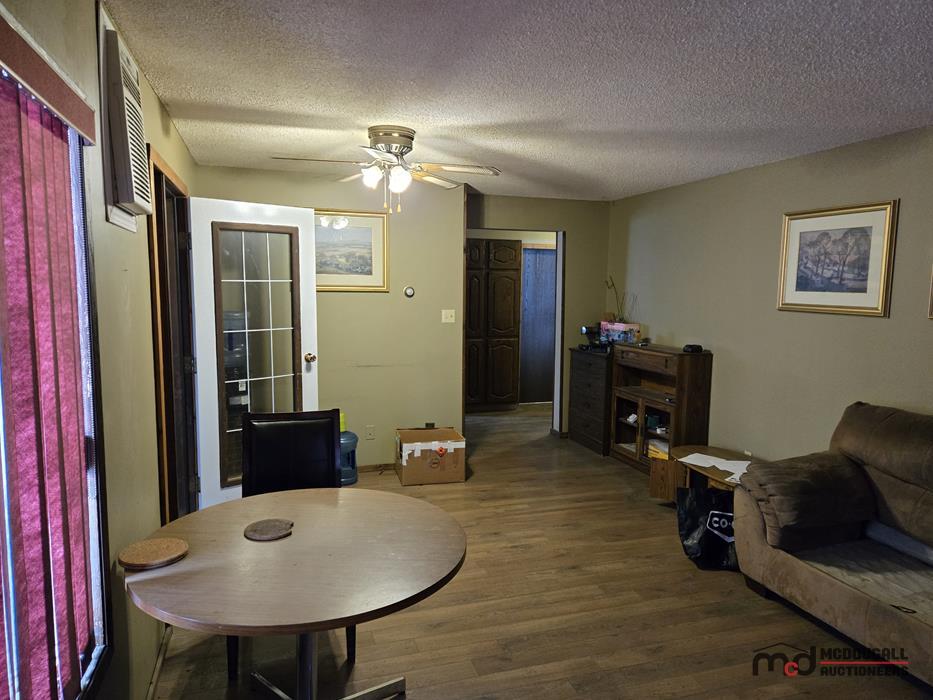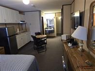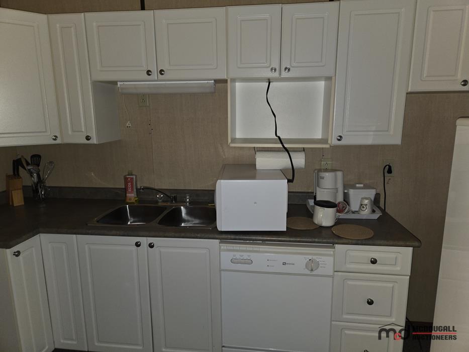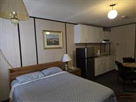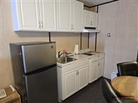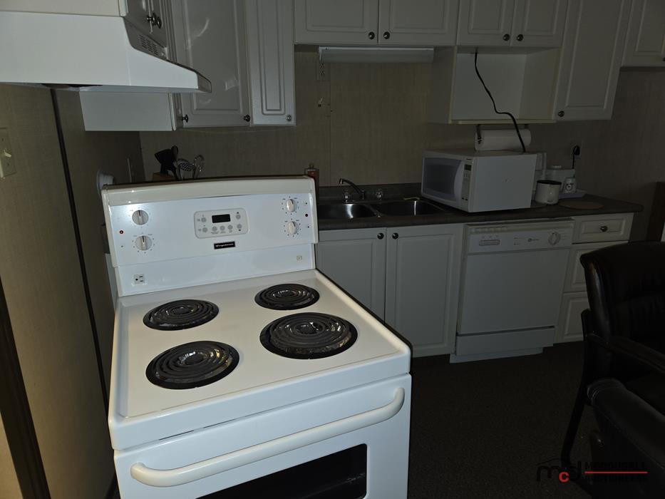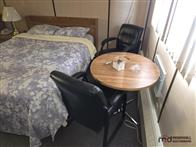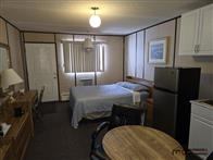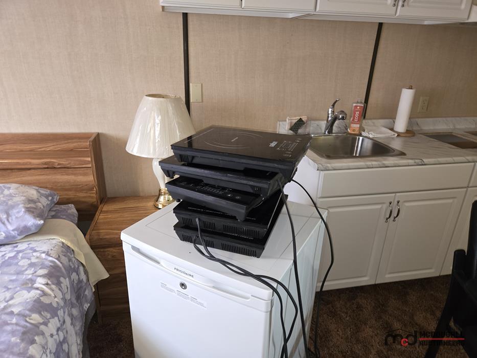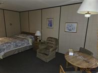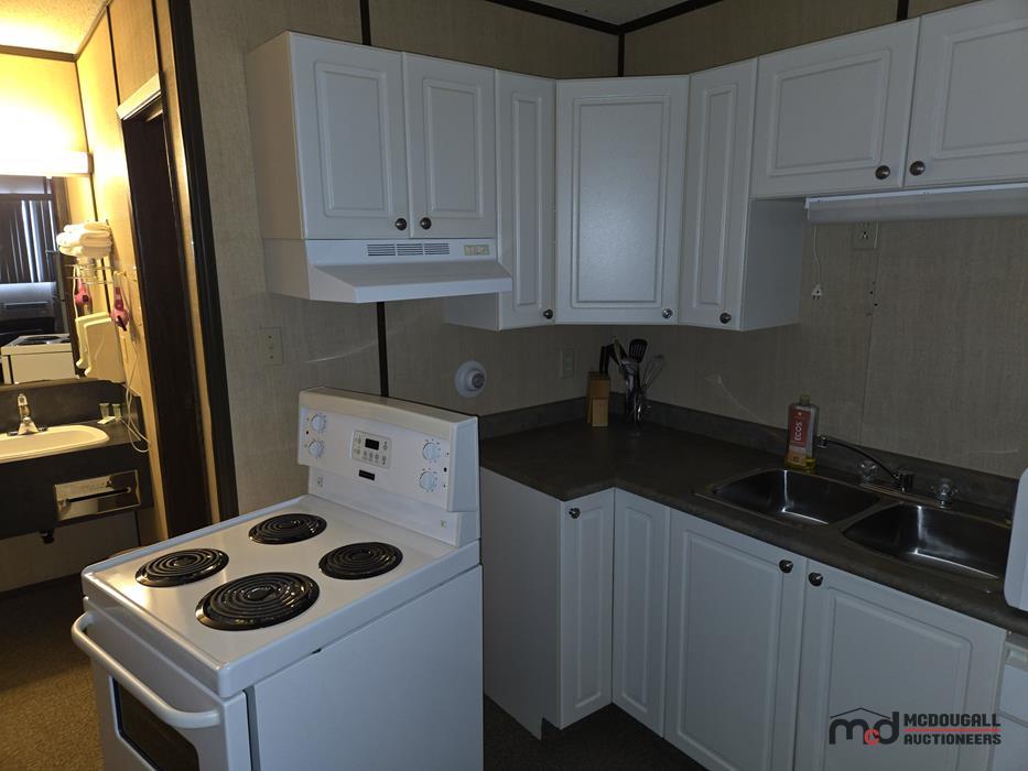 The motel building contains approximately 8,885 sq. ft. of guest room and common area space, together with roughly 1,175 sq. ft. of office and attached living quarters, for a total building area of about 10,060 sq. ft. Guest accommodation is arranged in a linear format and benefits from an internal hallway connecting the rooms, front office area, and related spaces. This interior circulation is a notable feature, as it may support a broader range of future uses than a typical exterior-access motel layout, including staff housing, extended-stay lodging, supportive living, or other care-related and institutional style uses, subject to buyer due diligence, municipal requirements, zoning, and any licensing or regulatory approvals. Four of the rooms are configured in a more suite-style format with added kitchen facilities for extended-stay use. The attached living quarters include a kitchen, living area, bedrooms, bathroom, and an addition currently used as a bedroom/office space. A detached two-car garage adds further storage or utility space on site.